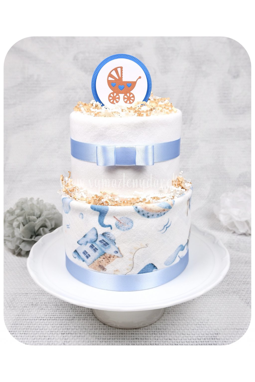 Korpus dortu tvoří 20 jednorázových plen Pampers New Baby-Dry (velikost 2 / pro váhu miminka 3 – 6 kg).